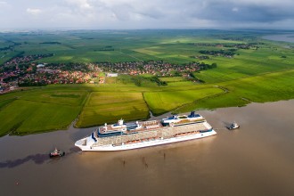 Im Schritttempo gleitet ein neuer Luxusliner der Meyer Werft in Papenburg auf dem angestauten Nadelöhr der Ems zur Nordsee