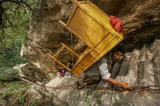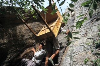 Selbst Betten und Möbel werden von Trägern über die steilen Steintreppen des Pilgerwegs geschleppt, Hua Shan