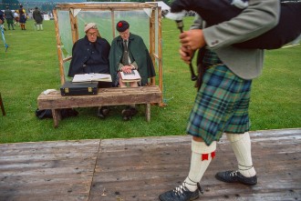 Weatherproof jury listens carefully to the bagpipers, Highland Games, Strathdon, Aberdeenshire 1992