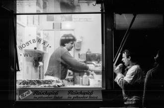 Rostbratwurst and meat skewer in spicy sauce, Bahnhofsimbiß, West Berlin 1987
